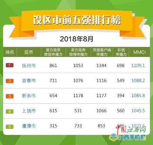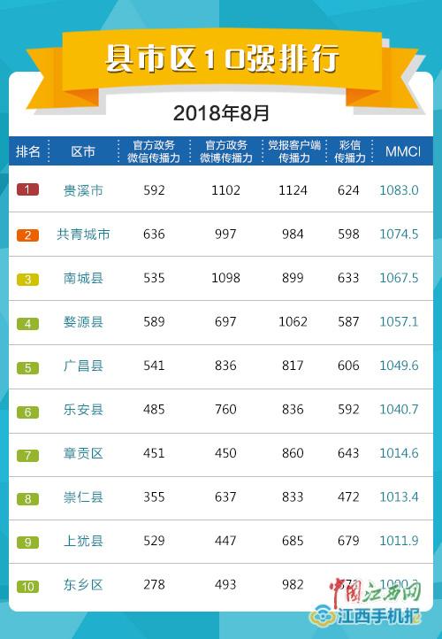 江西手機(jī)報(bào)訊 記者鄒艷紅報(bào)道:9月11日,江西省新媒體協(xié)會(huì)、江西師范大學(xué)傳播學(xué)院、贛鄱云大數(shù)據(jù)中心聯(lián)合發(fā)布江西地方移動(dòng)媒體2018年8月傳播指數(shù)排行榜。根據(jù)榜單顯示,本月黨政新媒體綜合傳播力設(shè)區(qū)市排名,前三甲分別是撫州市、宜春市和新余市。在縣(市、區(qū))黨政新媒體傳播力排行中,本月前六強(qiáng)分別為貴溪市、共青城市、南城縣、婺源縣、廣昌縣、樂安縣。本月榜單中,多個(gè)縣(市、區(qū))名次出現(xiàn)大幅波動(dòng)。余江縣從77名上升至37名,安源區(qū)從61名上升到14名,本月開通客戶端并且有1100.9的得分是安源取得巨大進(jìn)步的原因。